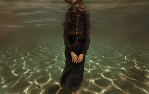 A dancer moves gracefully underwater, her body floating weightlessly as fabric flows around her. Light filters through the surface, highlighting her fluid movements and creating a sense of freedom and calm. The water becomes her stage, turning each gesture into a moment of quiet beauty.